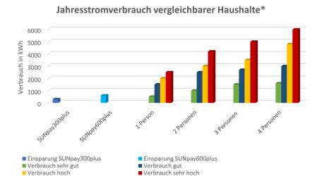 Mit dem SUNpay®300plus (600plus) können Sie, je nach Montageart und Gebiet, bis zu 300 (600) kWh im Jahr einsparen. Dies entspricht bei 300 kWh z. B. dem Stromverbrauch Ihres Kühl- u. Gefrierschrankes Klasse A+++, der Waschmaschine Klasse A+++, Standby-Geräte und bei 600 kWh entsprechend mehr. Unter Berücksichtigung der steigenden Strompreise amortisiert sich die SUNpay®-Solaranlage in ca. 6 - 8 Jahren.